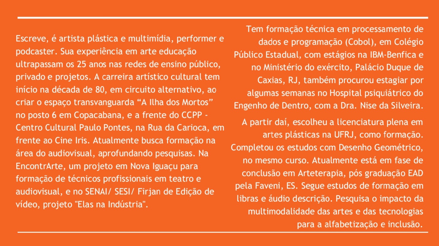 Artista multimídia tem formação em arte-educação e arteterapia. Desde 1984 atua nas áreas das artes, arte educação, tecnologias e cultura. Esteve a frente do reduto transvanguarda A Ilha dos Mortos, com o coletivo Brigadas da Cor, e com equipe no Centro Cultural Paulo Pontes, na Rua da Carioca, no final dos anos 80. Como arte educadora, concursada, atuou nas redes de ensino público de 1º e 2º Graus; em coletivos de arte e cultura alternativa, e trabalho voluntariado. Desenvolve escritas criativas, poesia, roteiros, é autora de adaptações teatrais, conteúdos didáticos e digitais. Pesquisa Interfaces multimodais para inclusão de não letrados.